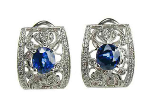 #8535 Ladies Rectangular scroll design earrings, oval sapphire and diamonds 14K white gold