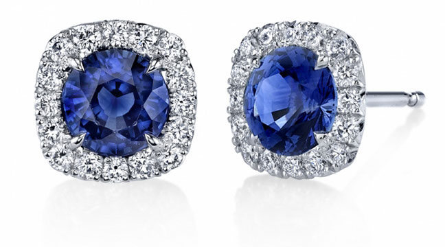 #8532 Ladies Cushion Shaped Halo, sapphire center, round diamonds 14K white gold friction post earrings