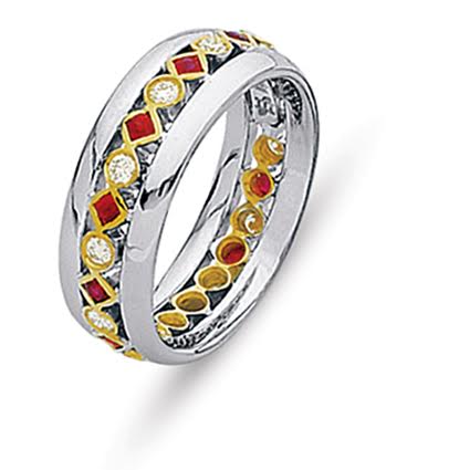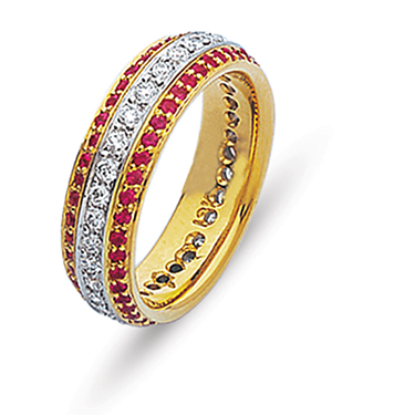 #7514 18kt two tone,round rubies/diamonds pave set eternity band