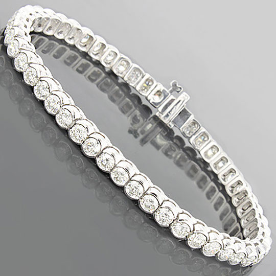 Diamond tennis bracelets are the most popular type of diamond bracelet. Tennis bracelets were originally called diamond line bracelets because the diamonds are set in a line along the entire length of the bracelet. The diamonds may be set flush beside each other, or may be spaced evenly along the length of the bracelet.