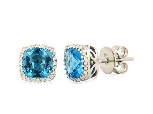 #8532 Ladies Cushion Shaped Halo, sapphire center, round diamonds 14K white gold friction post earrings
