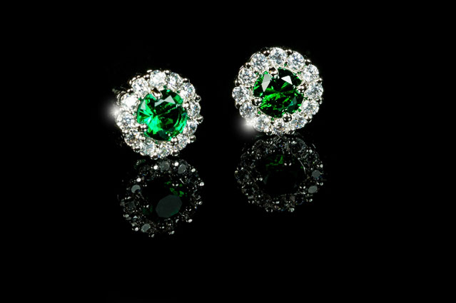 #8552 Ladies round emeralds ad diamonds in a 14K white gold cluster earing mounting