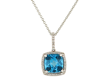 #8529 Ladies Cushion Cut Halo Pendant, blue topaz & Diamonds 14K White Gold