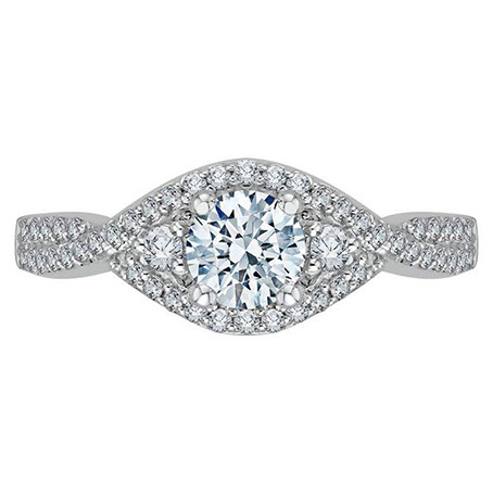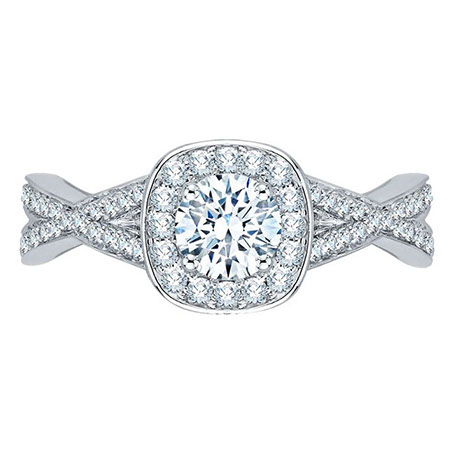 #9017- Ladies 14kt white gold, cushion shaped halo w/ dia. pave’ crossover mounting