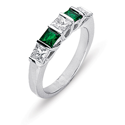 #7515 ladies platinum, princess cut emeralds/diamonds channel set anniversary band