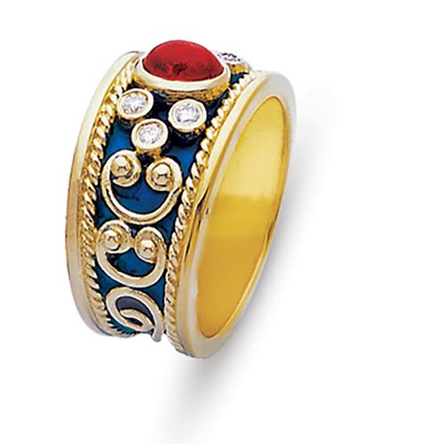 #7511 18kt Yellow Gold Blue Enamel Ruby and diamond