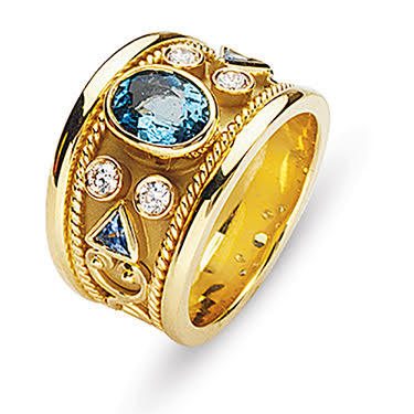 #7510- 18kt yellow gold, handmade, 10mm byzantine design w/ sapphire & diamond bezel set